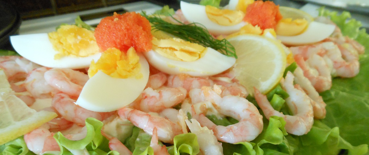 3. Tag räkorna och kräftstjärtarna och dela dem på mitten (Inte alla, spara några till garnering). Lägg i majonäsblandningen tillsammans med lite hackad dill och en nypa salt. En liten klick löjrom är också gott att blanda i.